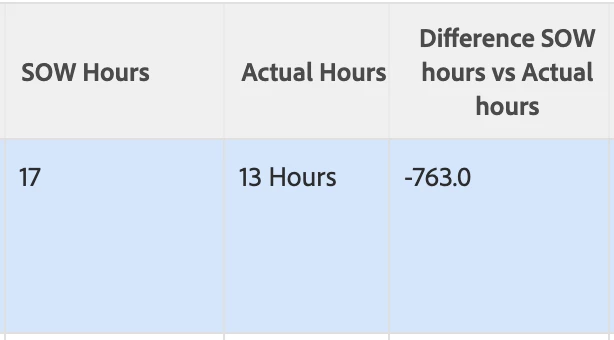 When I created the "Difference between SOW hours vs Actual hours" field, I set it up as a calculated field, containing the following expression SUB({DE:SOW Hours},{actualWorkRequired}) and it was not working at all, e.g. the column remained empty. Then I proceeded by editing the text mode of the column in the report to contain the same calculation e.g. SUB({DE:SOW Hours},{actualWorkRequired}) which still didn't work. Mind you at this point, I have both expressions, one in the field setup and one in the report column with the same name. I then proceeded to amend the expression by adding the /60 to account for Actual hours being a minute field which resulted in the column being populated finally, but still it was not showing the correct hours. Finally I deleted the expression from the calculated field set up, thus leaving the expression only the text mode of the column. That's when it returned the correct amount of hours in the colum.