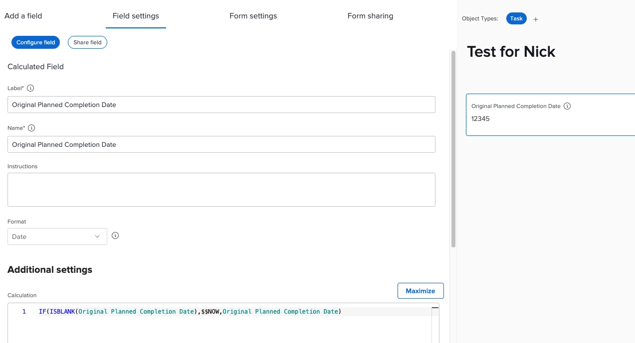 - Capture the Planned Completion Date value in this new field, and don't overwrite this value if the Planned Completion Date field value is updated after its initial value.