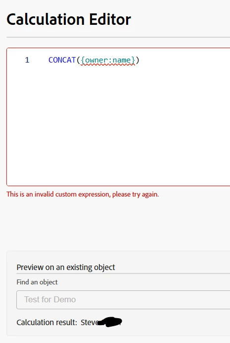I'm trying to pull the project owner name into a custom field on a form. Owner name is not an option in the fields, but ownerID is. I was able to use syntax for the name and it shows it in the calculation result (see image) but gives an error and won't let me save the expression.