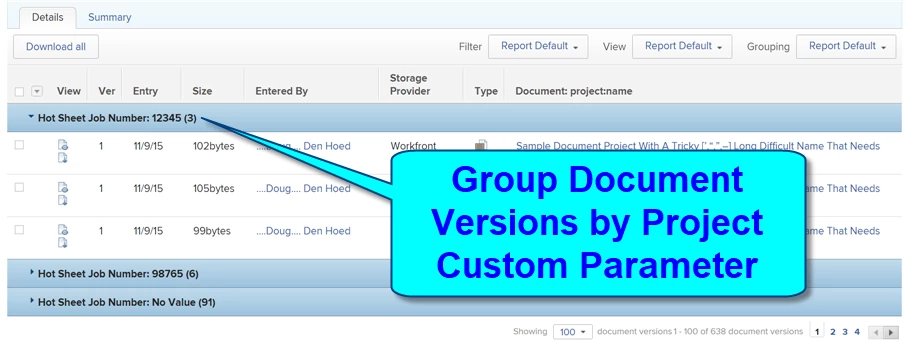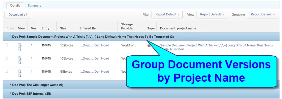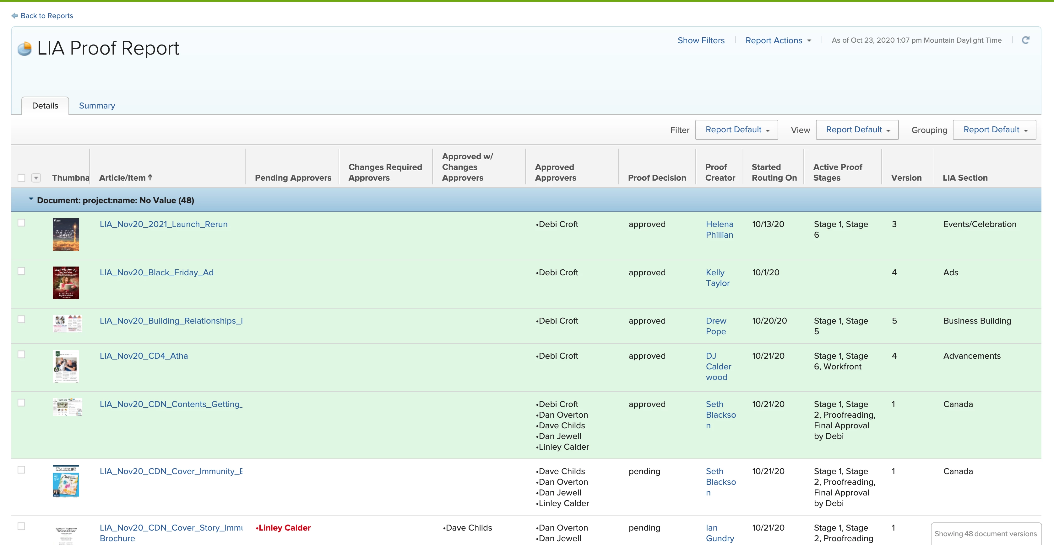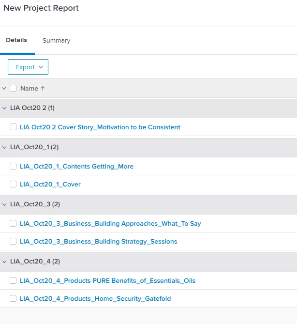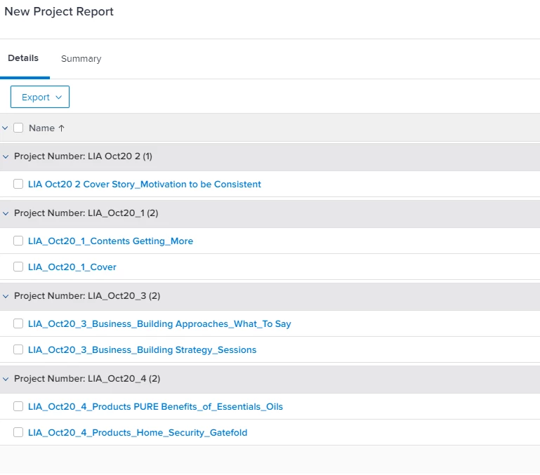 We need too be able to group by... Project >> Name >> Contains >> XYZ. We use a naming pattern system-wide that helps us stay organized and search for objects easier, but I would like to utilize it even further. In the following screenshot you can see how all the project names start with the same 2 components (LIA_Oct20) and then are further sorted by a name, section title, and other details.