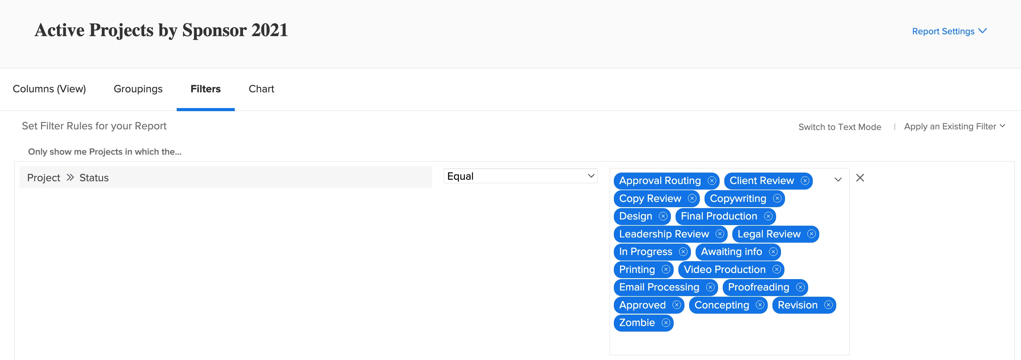 Hello, we've recently added a project status titled "Revision", however when we use this status the project doesn't appear in our Active Project Sponsor report even though I added it to the report setting filters. Would love help finding a solution so that our requestors can see their projects when this status is chosen.