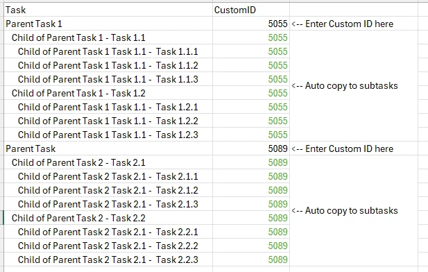 We have a complex WBS. In this WBS, there is a parent task called 'Custom'. It has many subtasks, and many of them also have subtasks. If we have no 'Custom' in the project, we close down the tasks. If we have more than one, we will copy the parent item and all its subtasks so that we can track and schedule each custom individually. Each 'Custom' has a unique ID, and on tasks, we have a field called "Custom ID". We want to enter the ID on the parent field and have this populate to all subtasks under the parent.