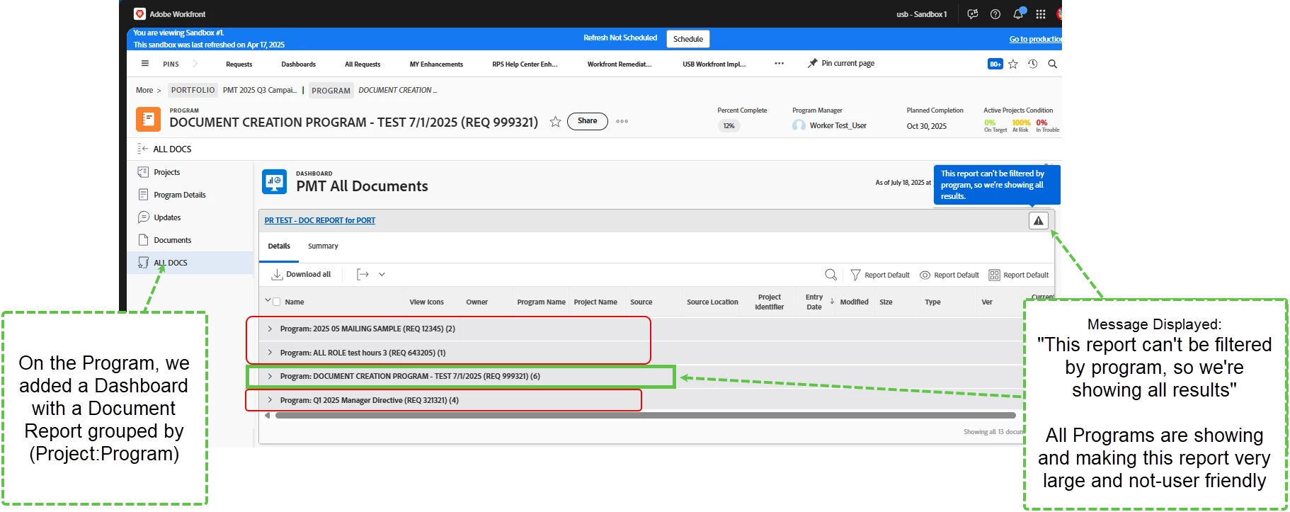 - All projects/programs are showing up in this report instead of just the program specific projects and a notice that says the report can't be filtered by program. (Image attached)