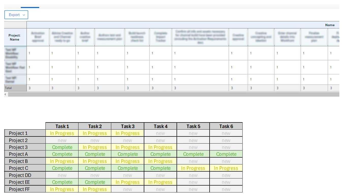 I’m trying to display task statuses in the matrix report below. I have projects as rows and tasks as columns. Below the image is an example of how I’d like it to appear. Once the status names are visible, I’m confident I can handle the color portion.