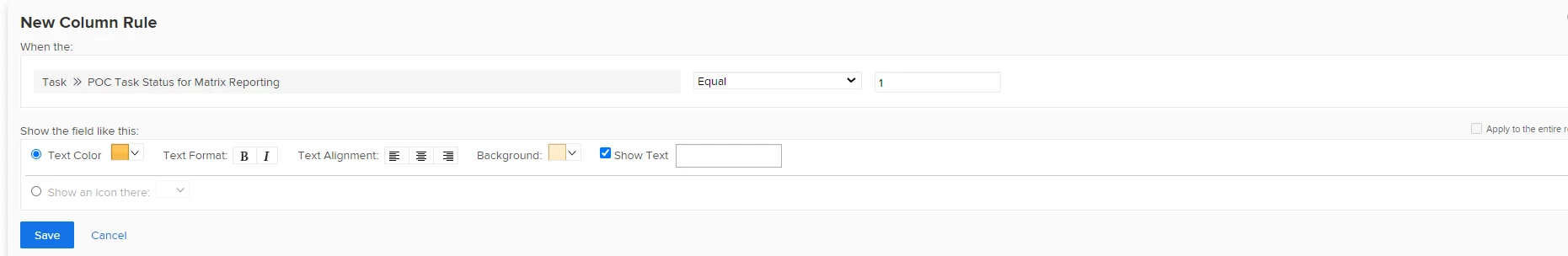 My goal was to display this field in the report. If I could get the value to show, I’d then use column rules to add color and select “show text.” See the screenshot below. However, I haven’t been able to get the value to display.