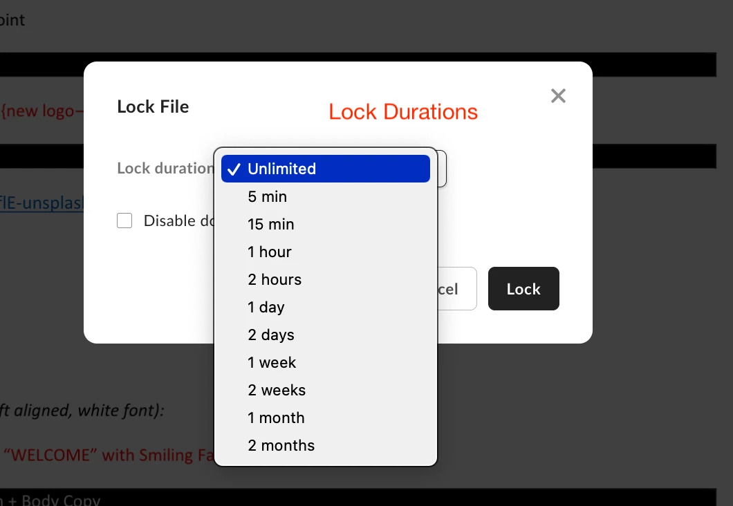 Description - Provide the ability to set a timer for how long you want to "temporarily lock" a document where the document unlocks itself after that time is up. Goal is to prevent other users from downloading the file while it is locked, and/or set an expiration time for the lock.
