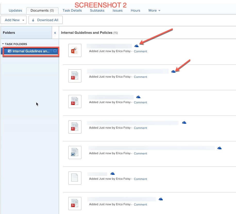 2. Once you select the file/folder, you will see it be added to the task/project/etc. inside Workfront. You will know when it has been added from OneDrive, because it will have a little cloud icon (screenshot 2). In this screenshot, I added a folder (during step 1), and you can see that it added all of the folders contents.