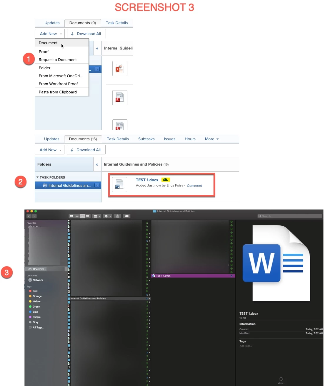 3. Users have the ability to open those files that you have added (it will open in the online version so that you can have real time edits and avoid different versions). OR, other users can add files to that folder inside Workfront and those files will automatically syn to your OneDrive folder. In Screenshot 3, I showed an example where I added a file called "TEST 1" from Workfront and you can see that it added the file to my computers OneDrive folder.