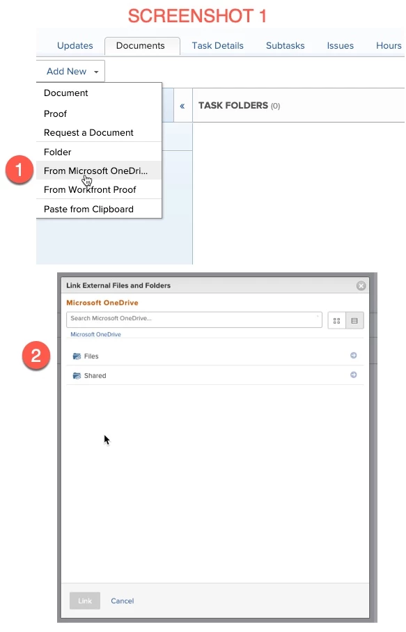 - From a task/issue/project/anywhere documents can be uploaded, you select "Add New --> From Microsoft OneDrive". (Screenshot 1)