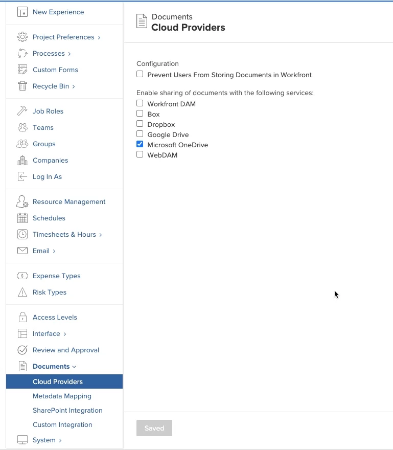 In the admin section, you only have control over what cloud providers users are allowed to link to. It's a simple "on" or "off". For us, we use OneDrive for all of our documents, so we have OneDrive turned on.