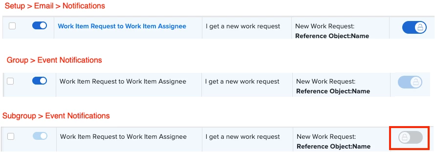 I have unlocked all Notifications in Setup. When I view the Group > Event Notifications, I can enable / disable all of the unlocked Notifications. However, when I view the Subgroup > Event Notifications all the Notifications are still locked.