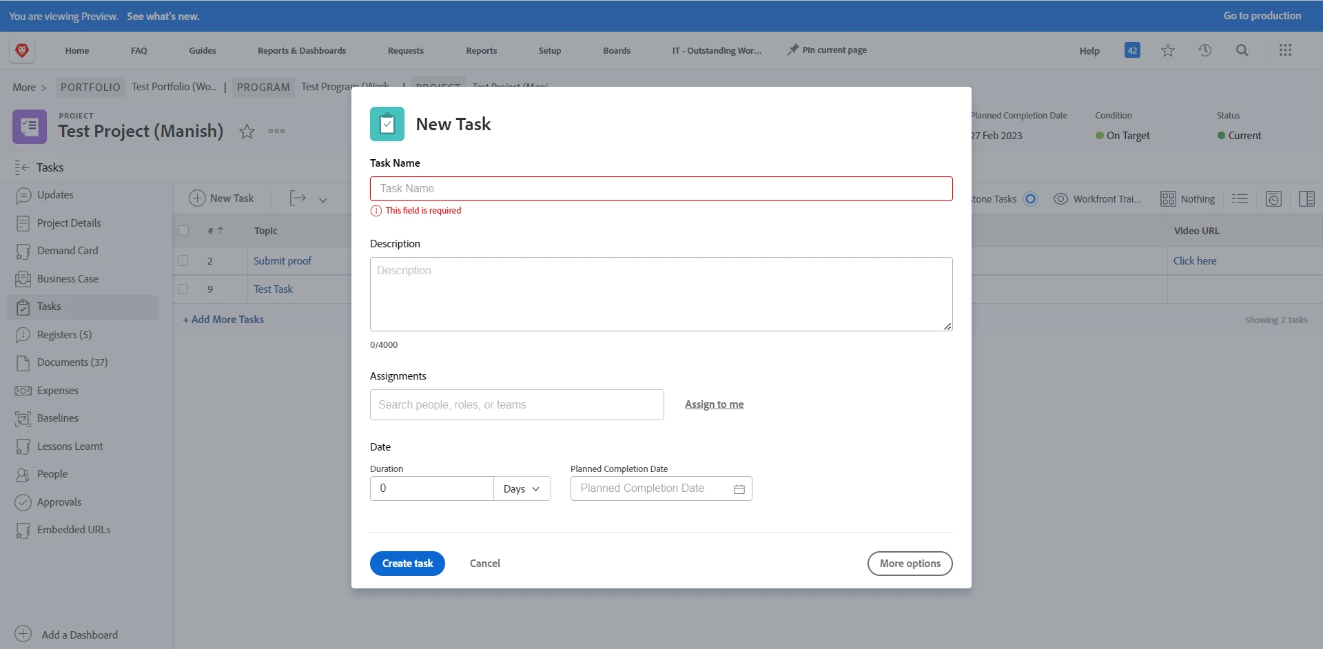 New Task Window:
