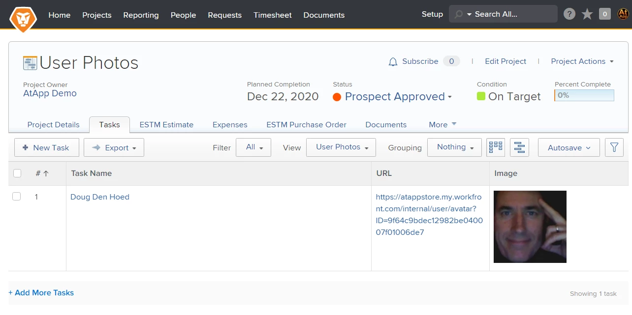 To improve this further, you could (as I did) bake the url to each person's image into a custom data field on a common User Form, making it easy to then copy/paste into the Task URL column. The calc I used was CONCAT("https://[domain].my.workfront.com/internal/user/avatar?ID=",ID)