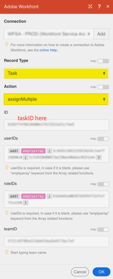 We require your help on multiple assignment in tasks. We are referring - Tasks (workfront.com) for multiple assignments like role, user & team through fusion.