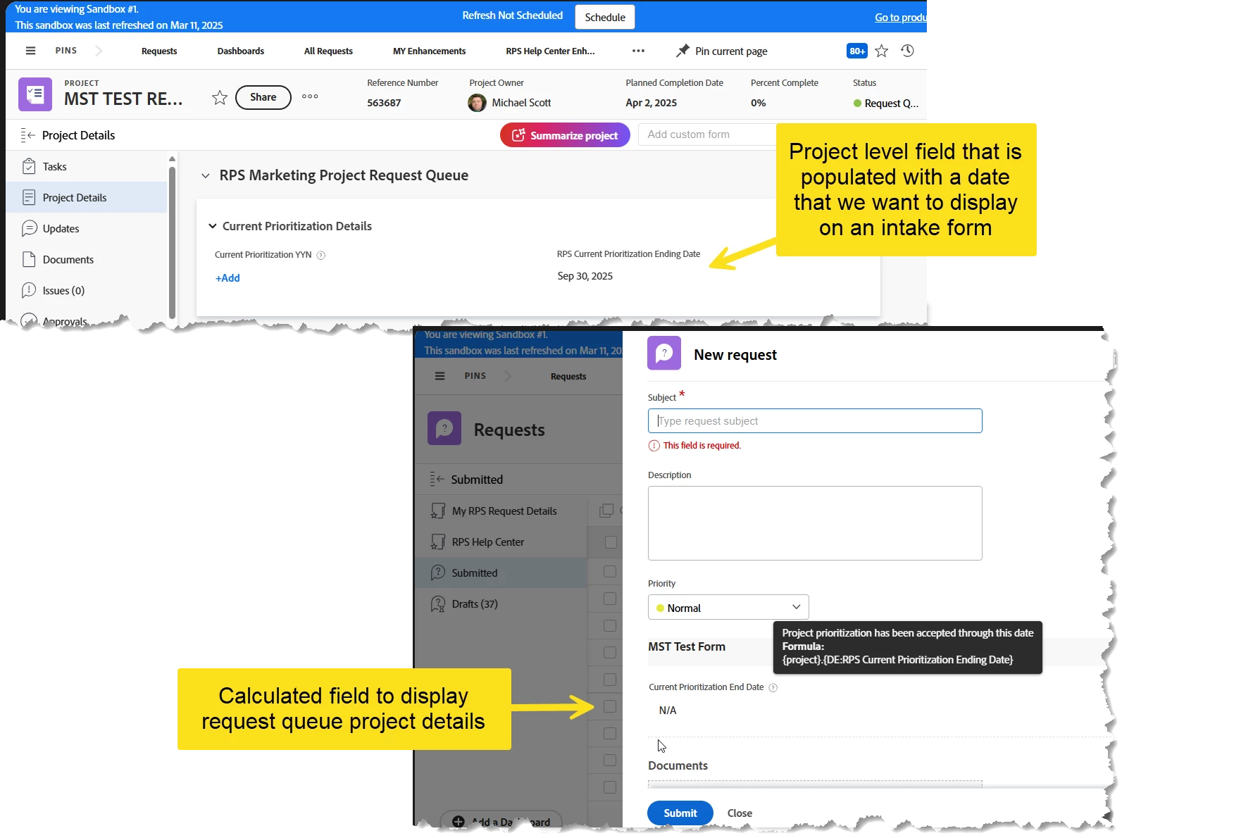 Idea: Allow ability to expose project level information on a request or issue form. We have a need to expose things like dates that allude to key deadlines or even things like key project data when submitting through issues on in process projects. This would help create much more flexible use of calculated fields and functionality that appears to be essentially there already.