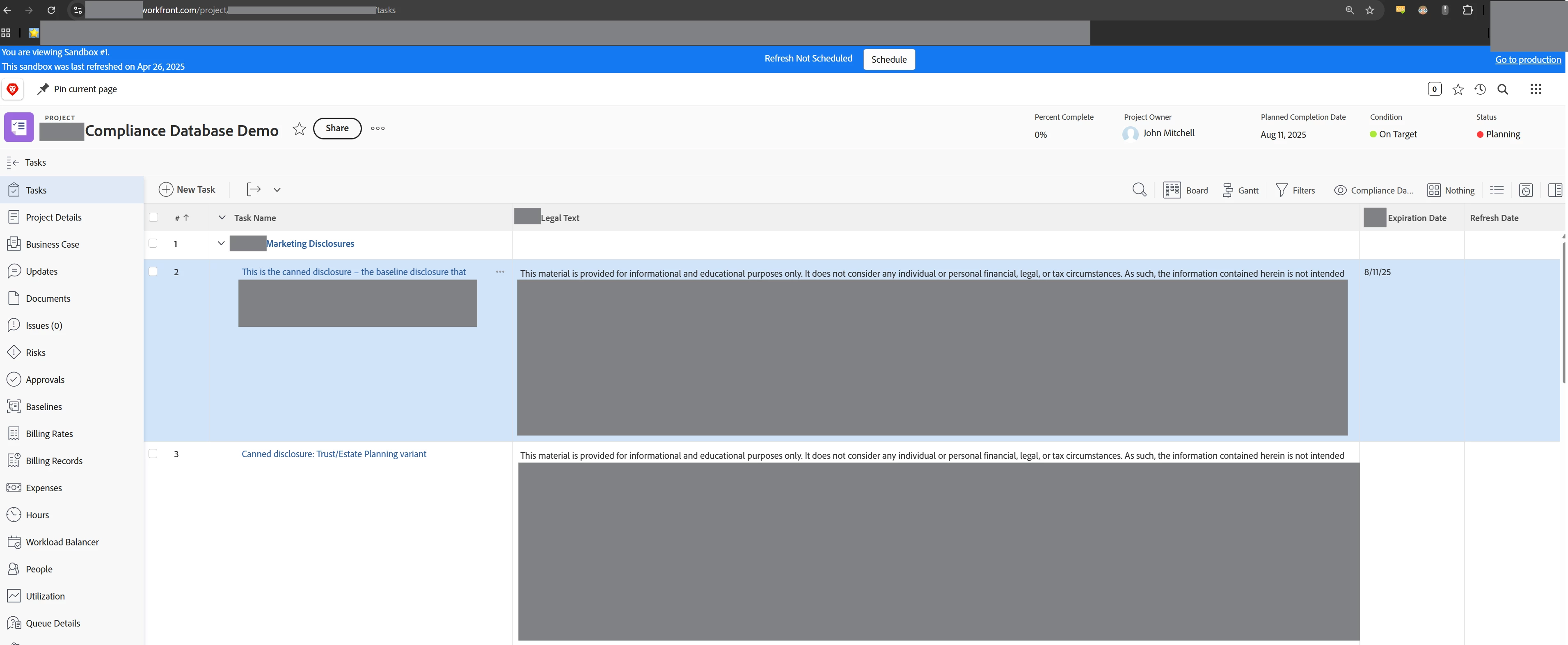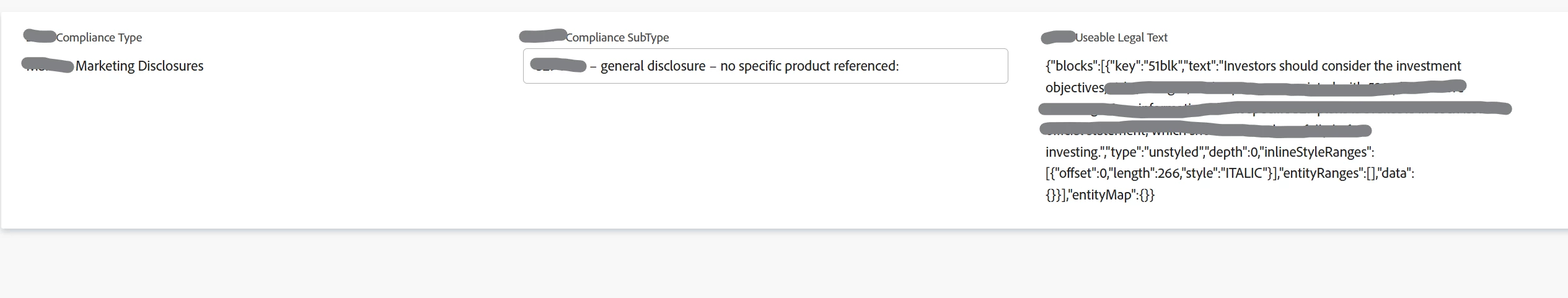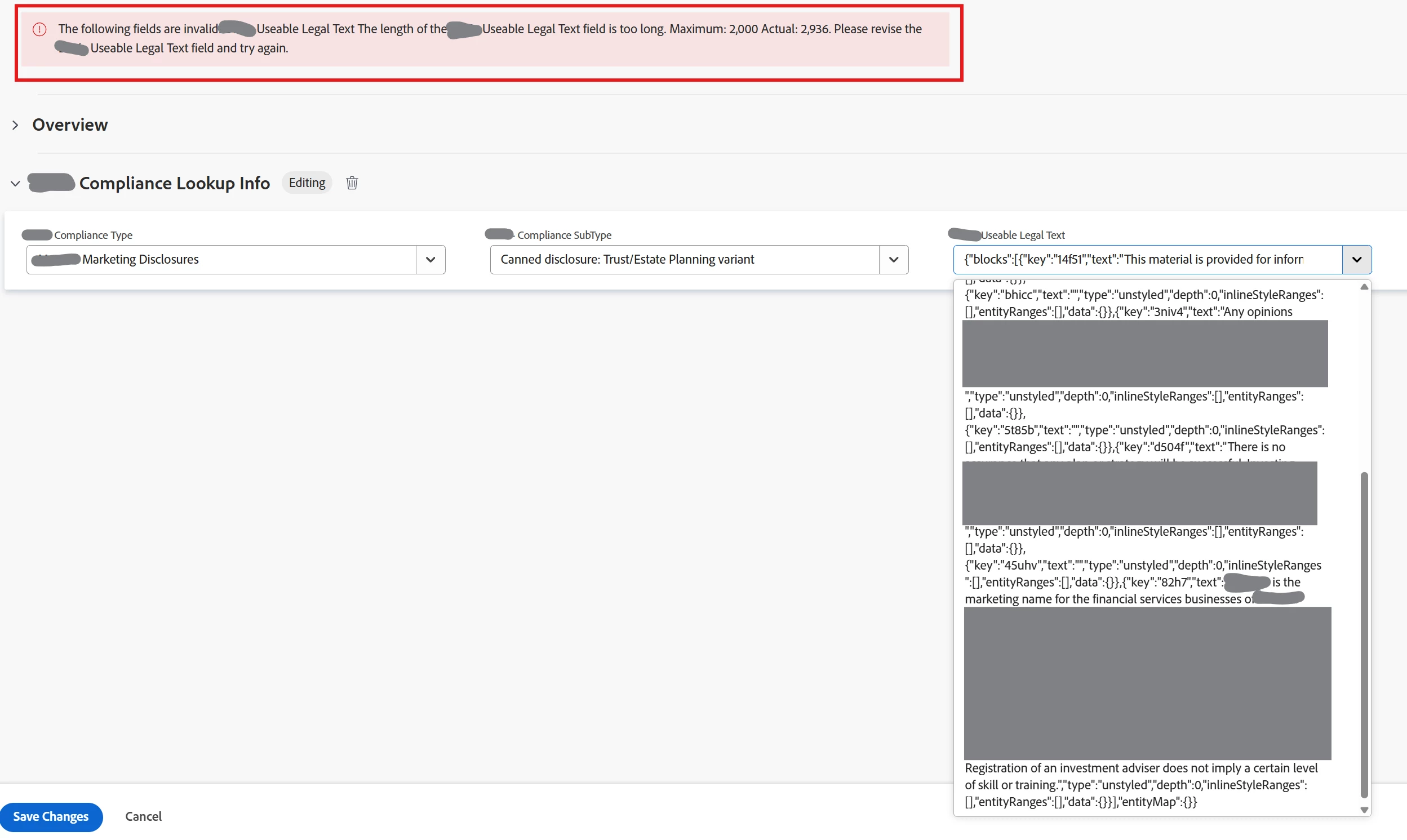 3. Lookup fields can be "broken" when the resulting JSON path finds a value that is stored larger than 2000 characters. The 1st screenshot is a reference picture, I am storing data on tasks and using the task/subtask task set as my external lookup targets #1 and #2. Those fields then use a 3rd external lookup to surface appropriate legal disclosures stored at the task level. I stored it as Rich Text to allow for the disclosure length of over 2k. Most disclosures are not over 2k, but once I stored a disclosure that is over 2k I ran into an interesting error in the 2nd picture.