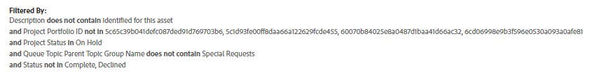 I'm trying to create a filter for an issue level report where the parent topic group does not contain a certain name. Sadly, parent topic group name doesn't appear to be one of the canned/selectable filters to simply add, unless it's called something other than parent topic group name. So, I'm resorting to text mode. I found this post (https://experienceleaguecommunities.adobe.com/t5/workfront-questions/filtering-on-topic-groups/m-p/502440#M34190) where someone else was able to filter by ID. But, the parent topic group ID is unique within each project, so ID isn't doable.
