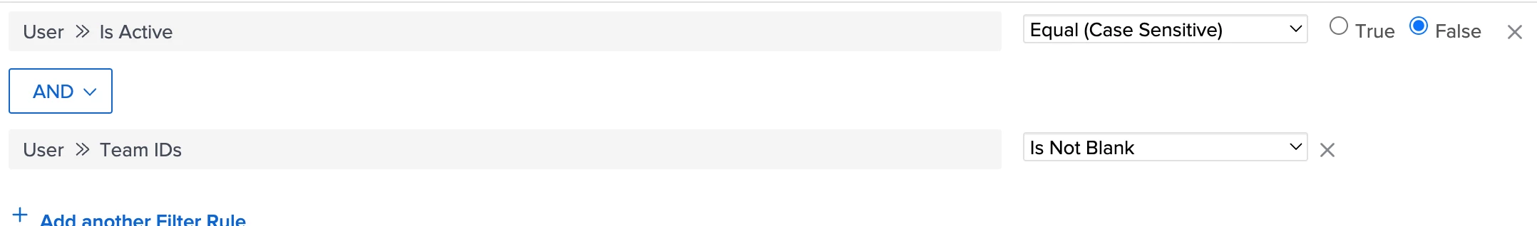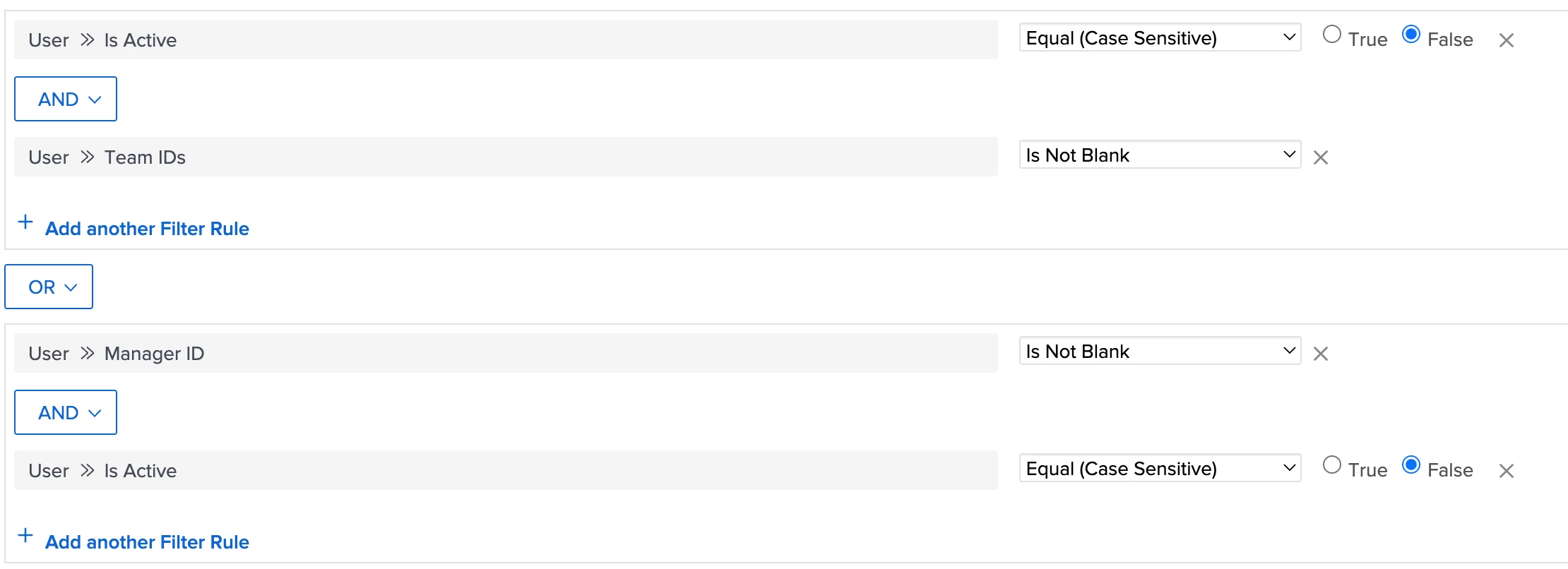 I'm trying to find inactive users who have a manager listed or who are still on a team. I can create a filter for either one but not for both. This should display deactivaed users where the Team IDs field OR the Manager field is NOT blank but NOT both blank.