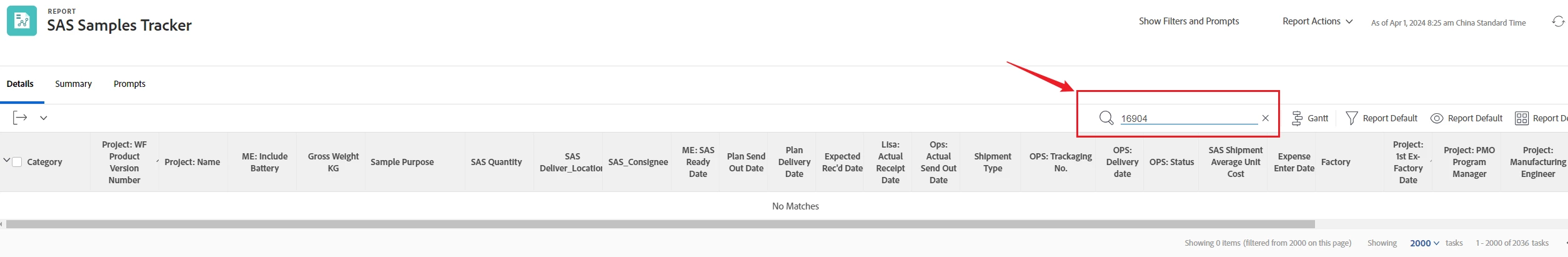 When I used the Workfront report with magnifying glass, I typed style number with searching, it didn't find anything (no matches). But I used the prompts with searching "style number", it did show up the things I wanted. see below screen shot.