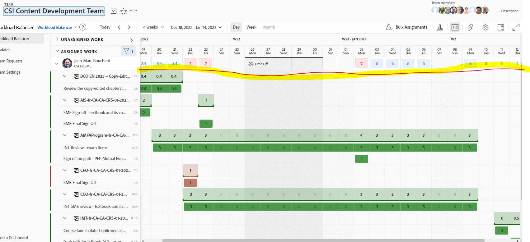 If one needs to scroll down, the total of hours disappears. We need to scroll down and up and down and up again to see if planned hours in a project isn’t overloading a day.