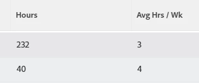 - Main group header: Hours 232, Avg Hours / Wk 38.67 > This is calculated by 232 / 6 = 38.67