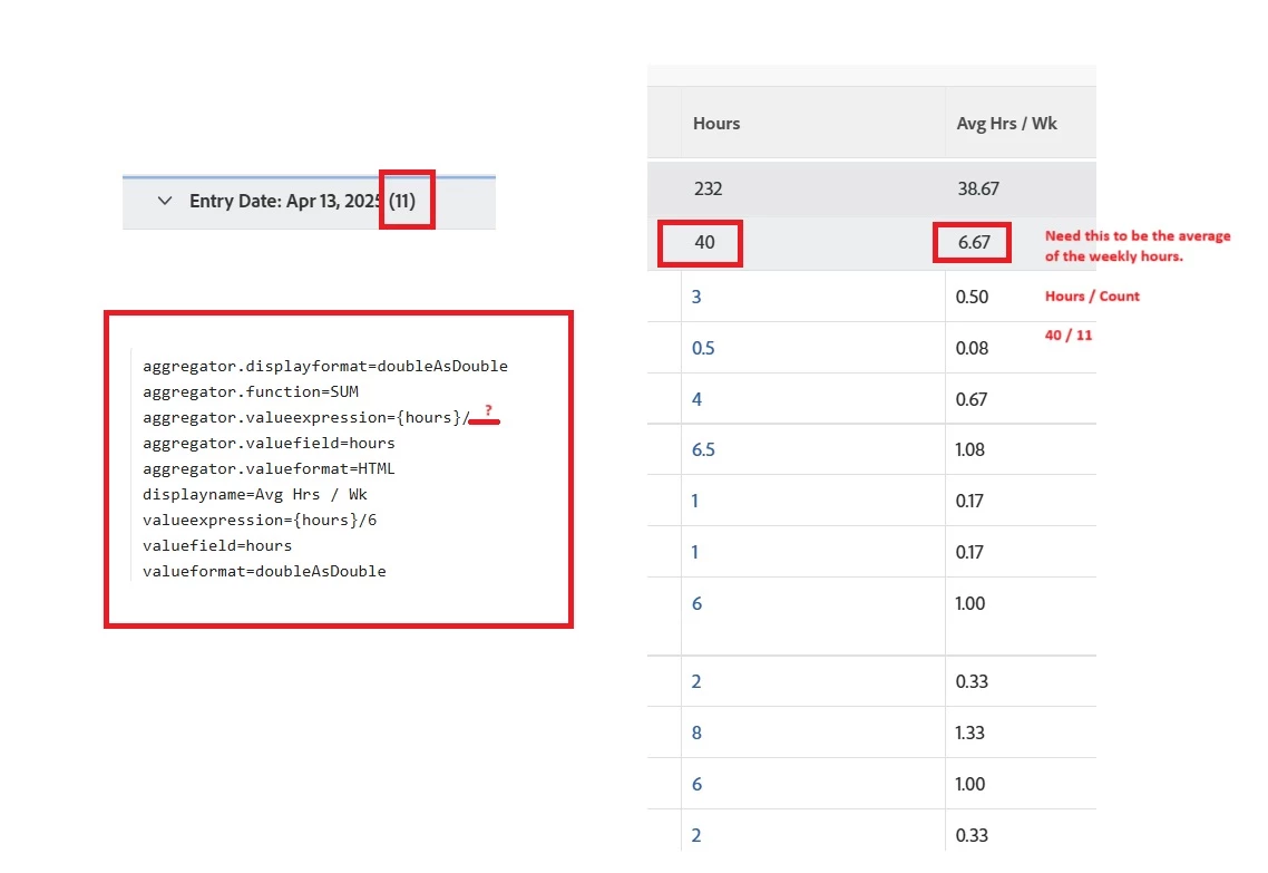 - Subgroup header: Hours 40, Avg Hours / Wk 6.67 > This is where I am running into the problem. I need to divide by the count. In the screenshot, the count is 11, so to get the weekly average is should be 40/11= 3.64.