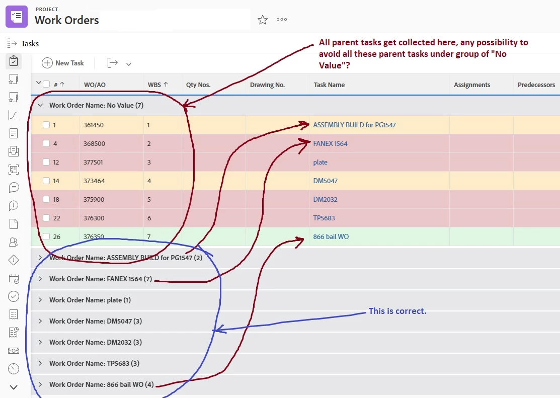 I am trying to run a task report to show task due in certain time frames (this week/overdue, next two weeks, etc.) I need those tasks to always GROUP by the highest-level parent (parent, grandparent, great grand parent.) However not all tasks have the same levels of sub-tasks. So some do not have grand-parents, and my current grouping is showing "Parent:Parent: No Value". I just want it to skip it if i there is no grand-parent and go to the parent.