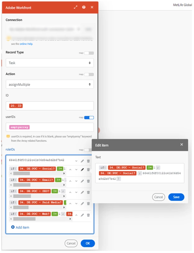 Initially, I tried setting the result to null when a role wasn't needed, but that generated an error. To work around it, I've been assigning a default role—specifically the project manager role, since they are always assigned to tasks. However, this results in the project manager being assigned multiple times when fewer roles are selected. For example, if two out of five fields are selected, the project manager role ends up appearing three extra times in the task.