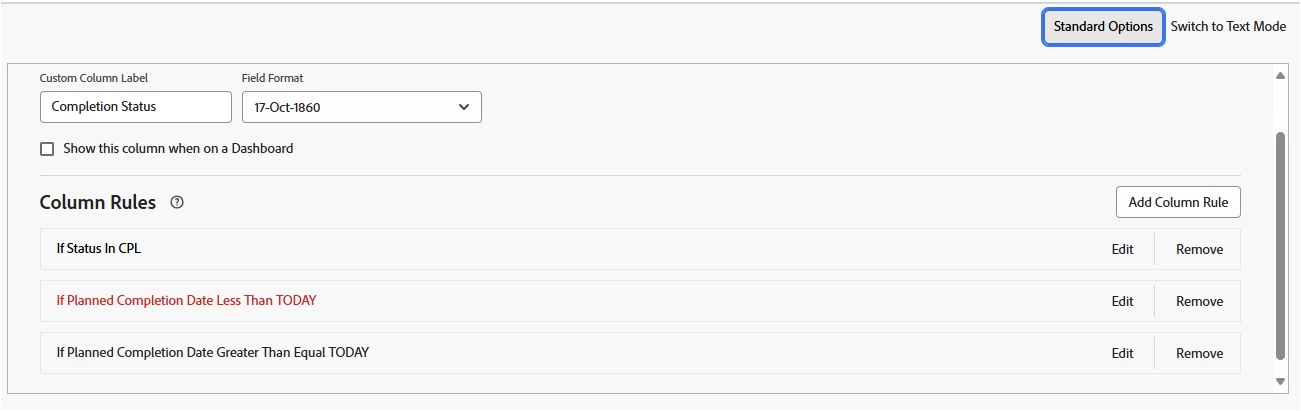 valueexpression=IF(ISBLANK({actualCompletionDate}) && {plannedCompletionDate} < $$TODAY, "<span style='color:#d30519'>Overdue</span>", "On Track")