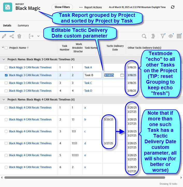 Based on this interesting challenge from @mariacr2, I'm pleased to share the following technique to easily edit a custom data parameter (e.g. a Tactic Delivery Date on a particular Task) and have it "echo" to its peers (e.g. all other Tasks on the same Project), without Fusion, and always kept "fresh" after each page refresh.