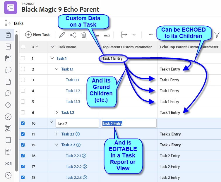 How to "Echo" Custom Data between Object Peers (e.g. Tasks within a Project)