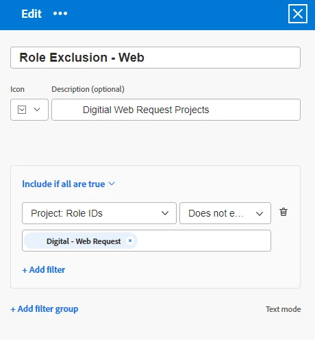 I tried to add a view where the project roleIDs does not equal and this only works if the only role in a project was for this web team.