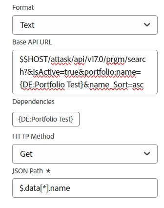 - Program: Now I want to display a list of Active Programs that correspond to the Portfolio the user just selected which is almost exactly what worked for the Portfolio with one more layer. In this example, 'Portfolio Test' is the name of the field I created in step #3 above.