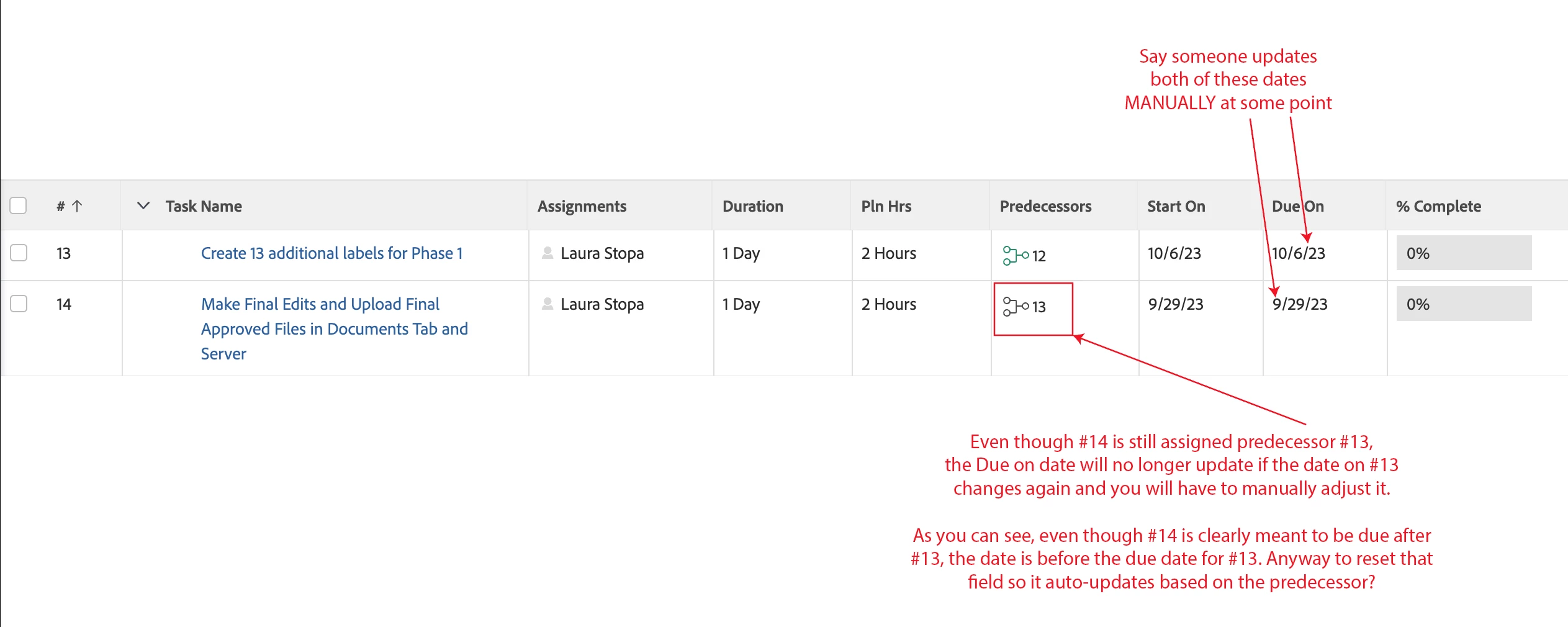 Let's say you set up a project and set all the predecessors, but the date on several tasks are manually changed for any reason. Once you manually edit a "Due On" date, it won't auto-update no matter what predecessors are assigned anymore.
