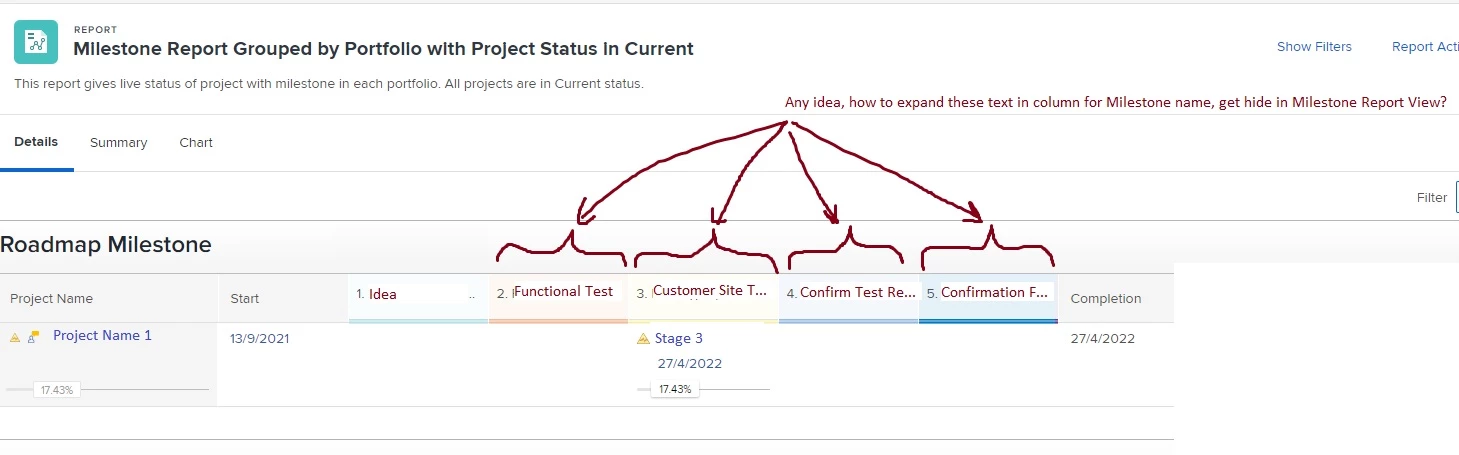 Any idea, how to expand these text in column for Milestone name, get hide in Milestone Report View?