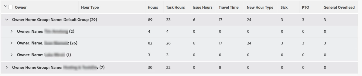 How to show the sum of hour types in each column on an Hours report?