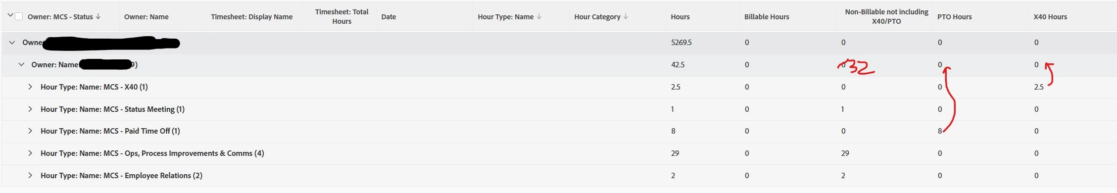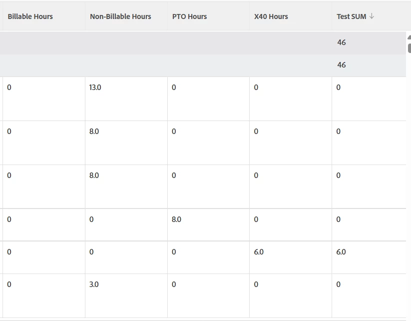 I created an hours report that breaks down hours by hour type in separate columns. Is it possible to sum each column? I tried the following but it gives me a sum of all the hours, not just the "X40" hours I'm filtering for.