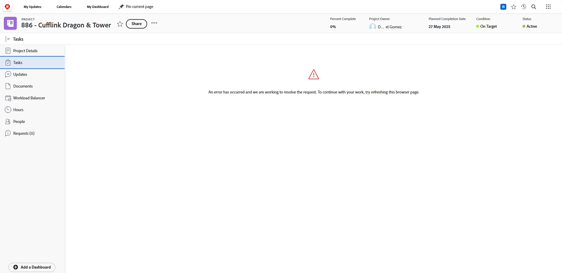 "An error has occurred and we are working to resolve the request. To continue with your work, try refreshing this browser page."