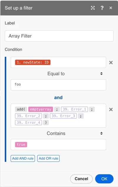ID = "foo" && (Error 1 = true || Error 2 = true || Error 3 = true || Error 4 = true)