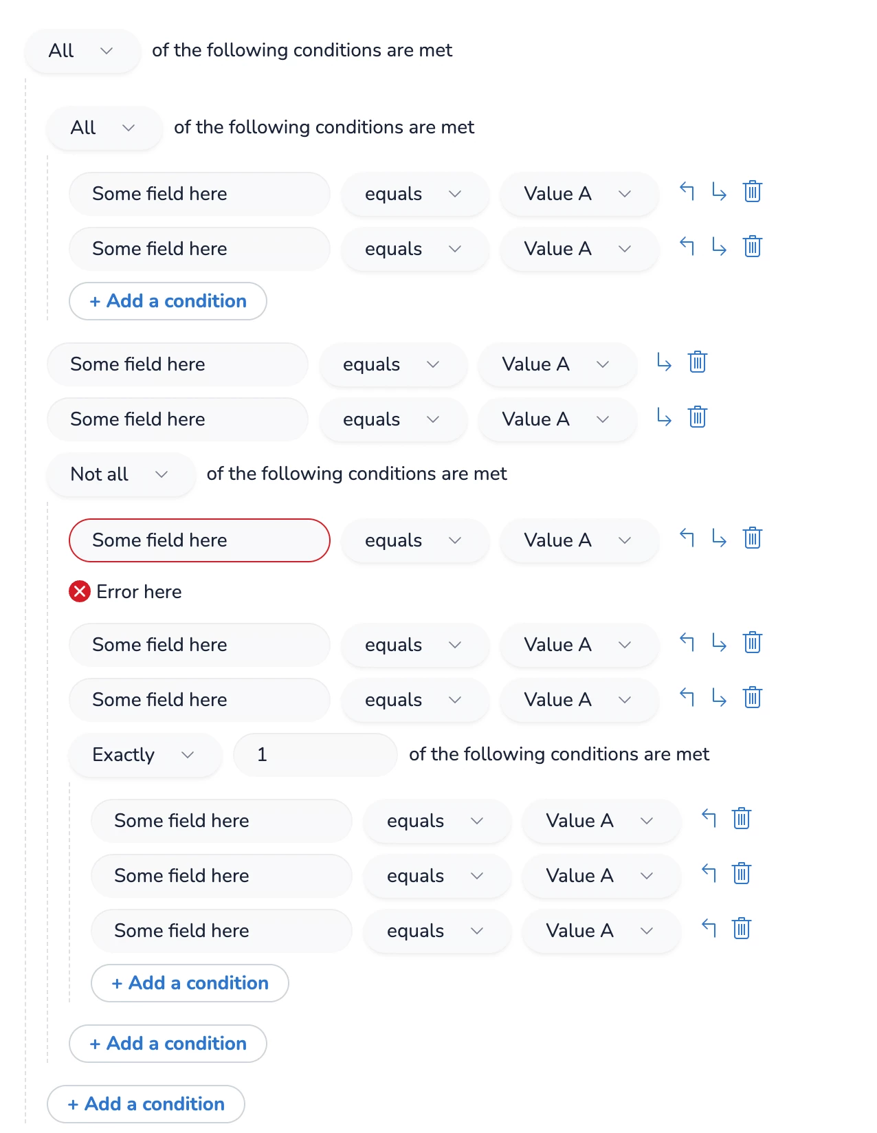 The ask is to improve the condition builder to allow for full Boolean logic. We have a similar version built into our own product, and I'm attaching an example of what that type of UI might look like as a concept to showcase how to think about the proposal.