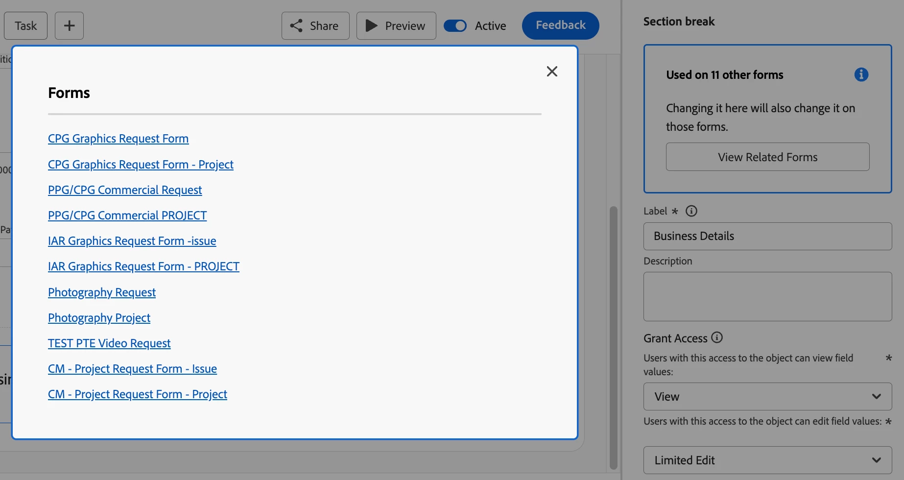 Description - When building a custom form you can view fields and sections in the form library. On the right panel it will note if it is used on other forms and you can click "view related forms" to get the full list. This list is incredibly helpful as is but would be more powerful if it indicated active vs inactive forms.