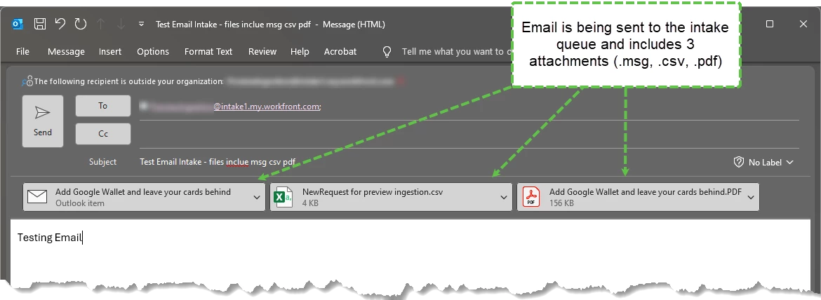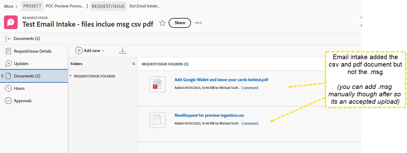 I created an Intake Email request queue that we are exploring using to capture documents/email previews which would apply the documents into various projects for review and approval. The csv and pdf in the testing intake queue are showing up in the documents as expected, but any attached .MSG documents are not being added to the request documents via the email intake process. We are able to add .msg files manually into documents after to confirm it accepts those as documents, but does not appear to be recognizing these as an attachment in an email.