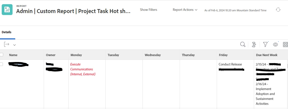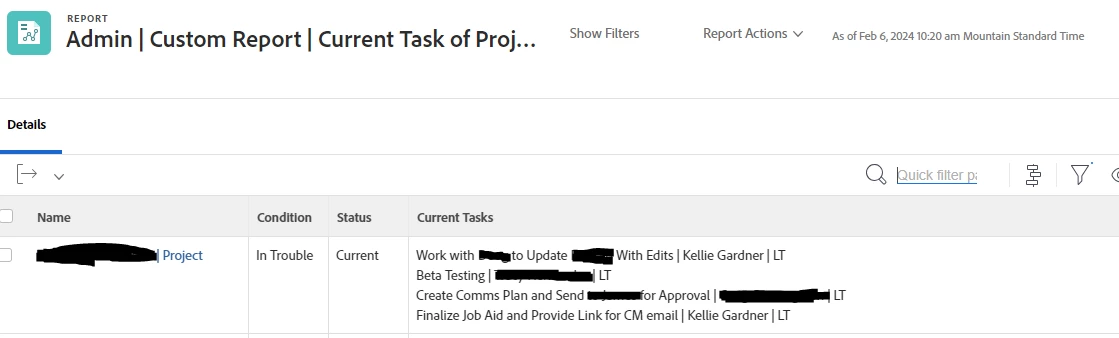 Looking for a report template or filters and grouping suggestions to have a report that shows all active projects with a team that shows what stage/task each project is at, by task name and planned duration vs. actual duration.