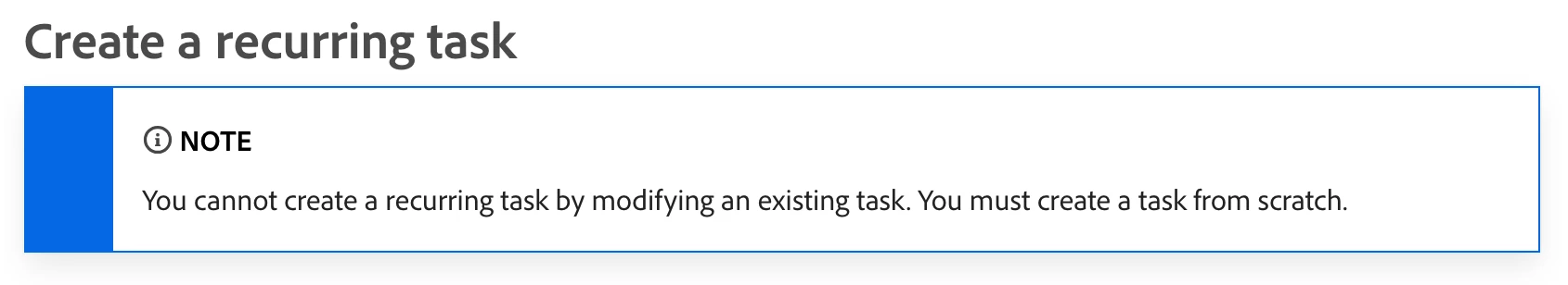 I have a coworker that wants to make it so that existing tasks on projects that they have are recurring and have a frequency tied to them. From what I can tell, Workfront only allows the user this option when creating a new task in a project, but I cannot see a way to do it for existing tasks without recreating the original task. Is there a way to work around this limitation? Am I overlooking something obvious? Or am I correct in telling my coworker that all project tasks need to be established as recurring and/or with frequency assigned from the creation of that task, or else nothing can be done?