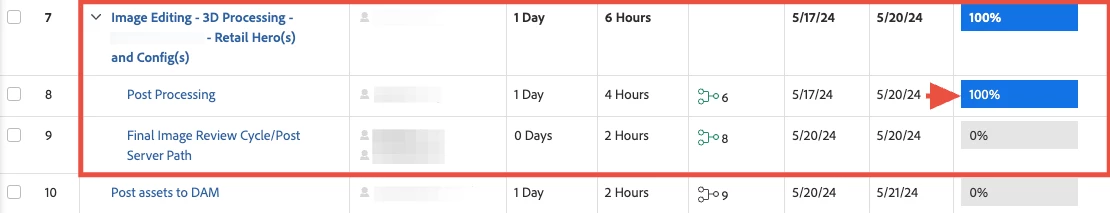 I have a Task with two Sub-Tasks below it. We use this Task/Sub-Tasks a lot. Typically, when the first Sub-Task (Post Processing) is completed, the Task displays 50%. For some reason it is now showing 100% and the Assignee thinks his Task is complete when in fact he still has the second Sub-Task to complete.