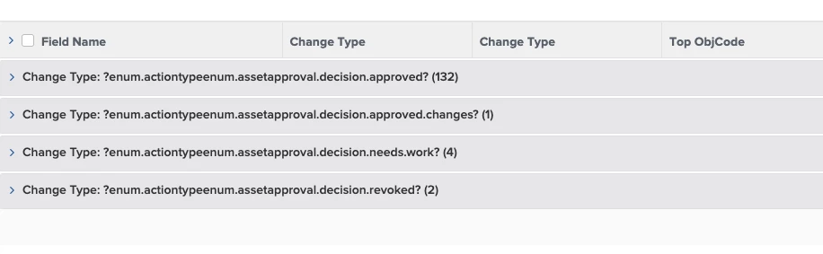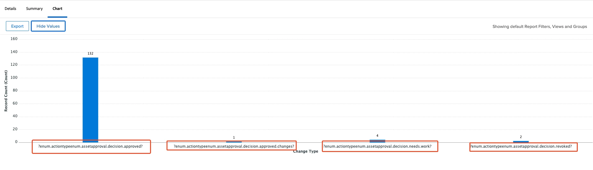 To get an informative chart, I have grouped by the changeType, but unfortunately both the grouping titles and the chart labelling show enum.actiontypeenum.assetapproval.decision.* surrounded by question marks. Can I somehow change this to the three-digit abbreviations, or even better, to a customised label?