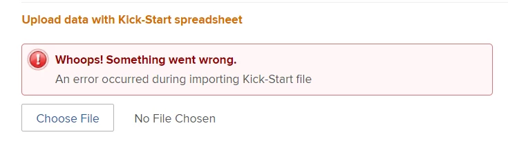 Usually when I have a kick-start error, WF specifies the offending field. I tried the kick-start a second time and received the same error. After a few minutes, I decided to run a test kick-start (with only a few records) to make sure nothing was wrong with my spreadsheet. My Projects module suddenly refreshed, and I found that apparently both original kick-starts had actually completed--I had over 800 new records. I wanted to delete the new records and start fresh, and that took a longer-than-normal time (I ran a speed test--I'm getting over 400 Mbps both up and down, so that's not the problem). I was able to kick-start my test file without issue, but again the full file throws an error (it's been 10-15 minutes, and I still haven't seen the new records). I've run other kick-starts with a similar number of records, so I don't think that's the issue either.