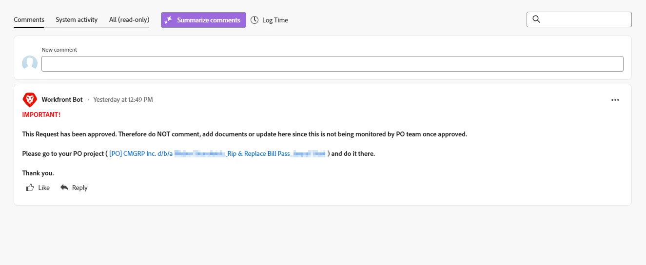 Description - Once an issue has been approved, we convert it into a project, and I would like to lock the comments (updates section) in my issues (nobody can enter a new comment) once it has a resolving project related to it.