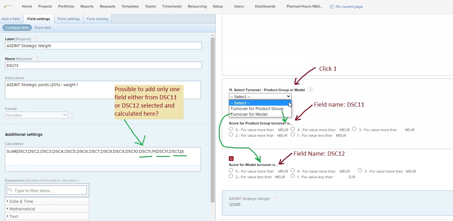 The outputs for DSC11 & DSC12 are strings, not integers. So if you wanted to extract a number from those fields, are you just wanting to capture the first number in the selection? So if someone selects "5 - For value more than...", you'd want the sum to capture the value "5" and then add that to the rest of the formula, correct?