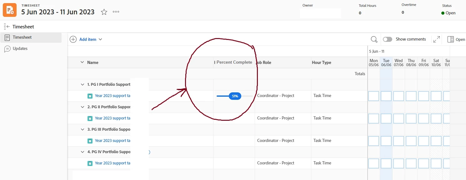 Note: it would be great to see the progress of task in percent complete in timesheet level also. Refer below. User directly manage progress from here too.